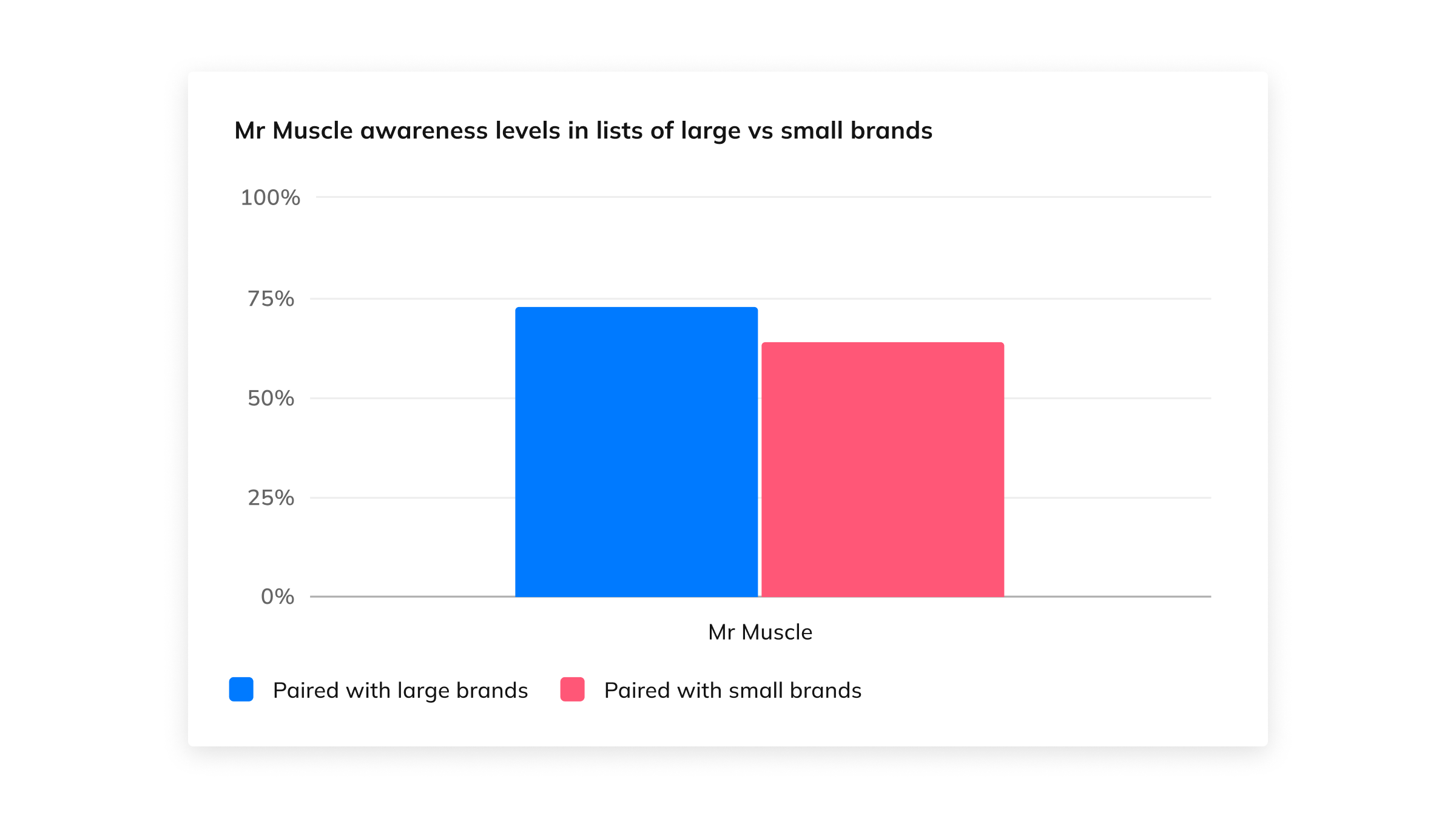The results showed clear differences in the awareness levels of Mr Muscle in the different list compositions. When Mr Muscle was paired with other large brands like Persil, 73% reported being aware of the brand. However, when Mr Muscle was paired with small brands, like Seventh Generation, only 64% of respondents reported knowing the brand - a drop of 13% (which in the UK represents 4.6 million adults).